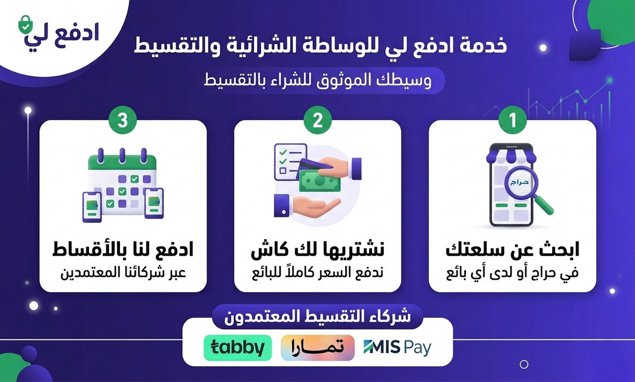 هذه الشراكات الاستراتيجية تعني أنك عندما تختار الشراء عن طريق خدمة "ادفع لي"، فأنت لا تتعامل مع أفراد أو جهات غير معروفة، بل تتعامل مع منظومة مالية متكاملة ومصرحة. نحن نقوم بدور الوسيط لتمكينك من استخدام حساباتك في تابي أو تمارا أو مس باي لشراء سلع من أفراد لا يوفرون هذه الخدمة. أنت تدفع القسط الأول فقط عبر بوابة الدفع الآمنة للشركة التي تفضلها، ونحن نتكفل بشراء السلعة لك من البائع ودفعها له نقداً، بينما تتابع أنت سداد باقي أقساطك المجدولة بكل أريحية عبر تطبيق شركة التقسيط.